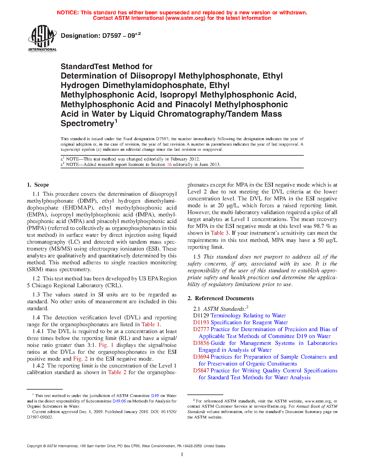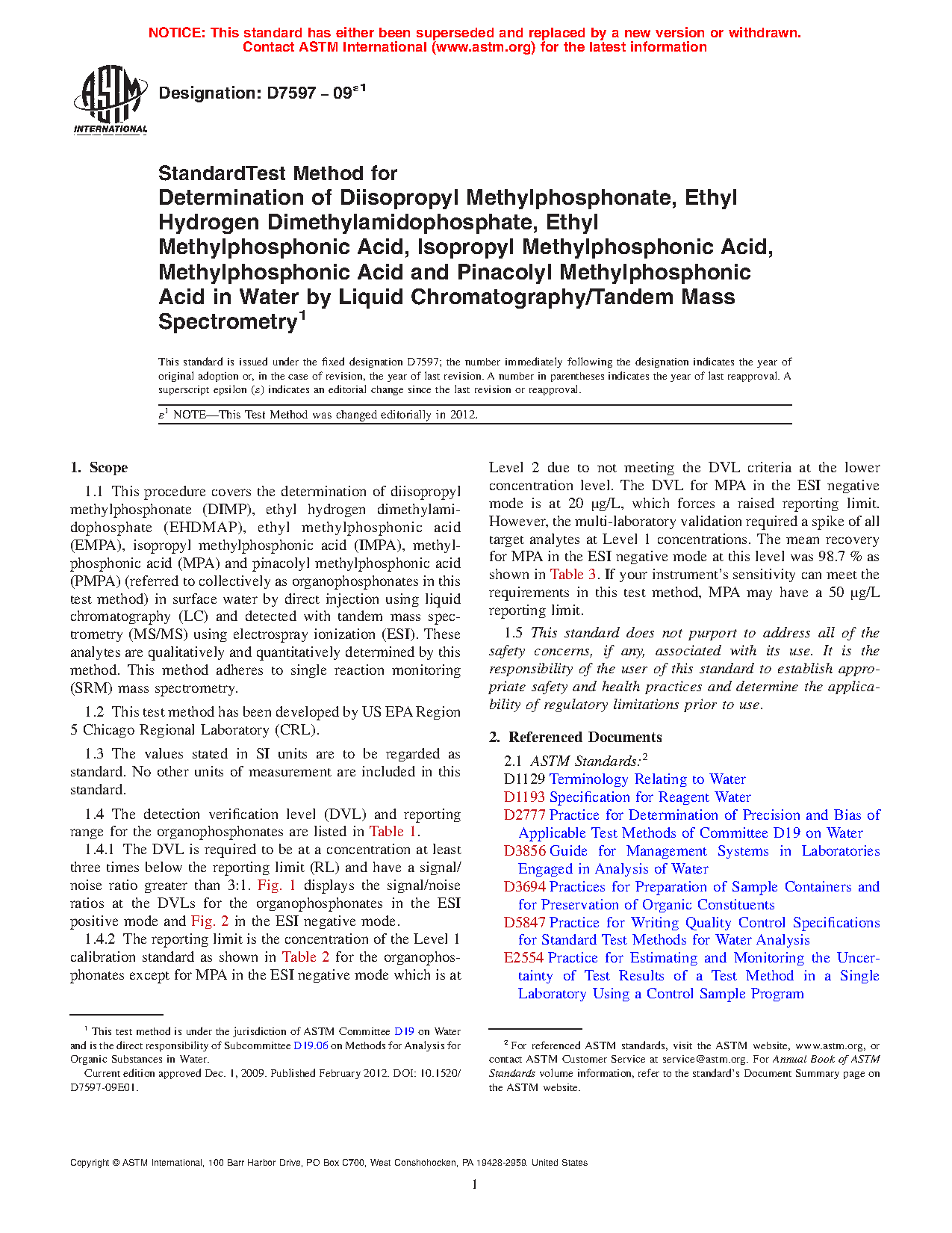 1.4 The detection verification level (DVL) and reporting range for the organophosphonates are listed in Table 1.
