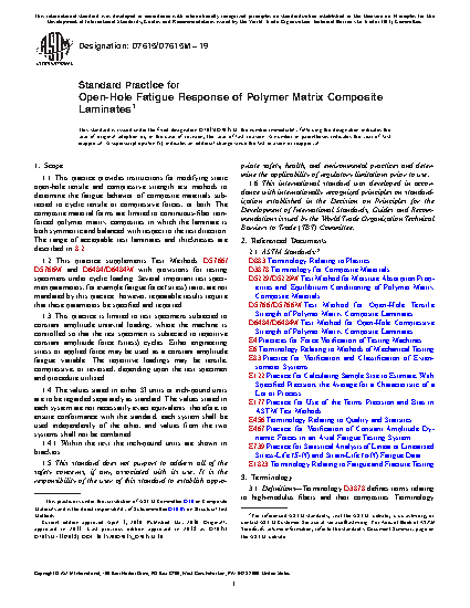 1.1 This practice provides instructions for modifying static open-hole tensile and compressive strength test methods to determine the fatigue behavior of composite materials subjected to cyclic tensile or compressive forces, or both. The composite material forms are limited to continuous-fiber reinforced polymer matrix composites in which the laminate is both symmetric and balanced with respect to the test direction. The range of acceptable test laminates and thicknesses are described in 8.2.