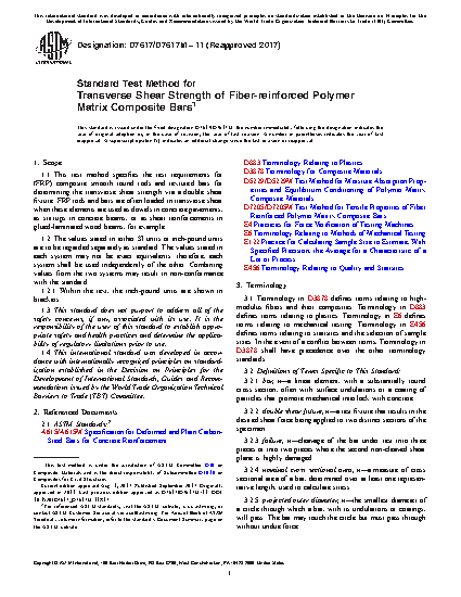 1.1 This test method specifies the test requirements for (FRP) composite smooth round rods and textured bars for determining the transverse shear strength via a double shear fixture. FRP rods and bars are often loaded in transverse shear when these elements are used as dowels in concrete pavements, as stirrups in concrete beams, or as shear reinforcements in glued-laminated wood beams, for example.