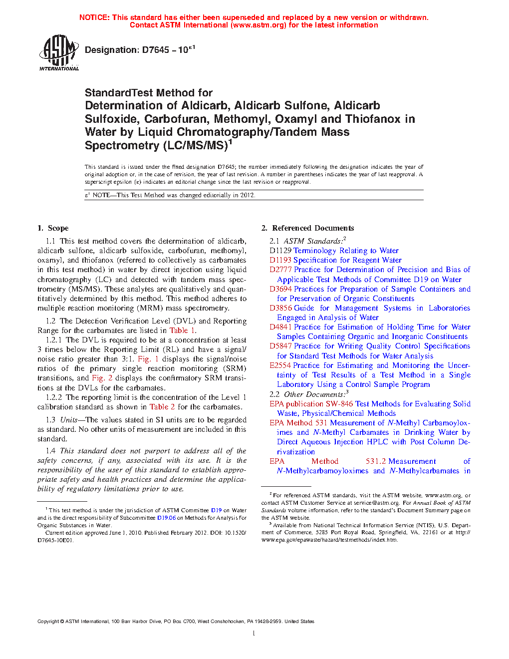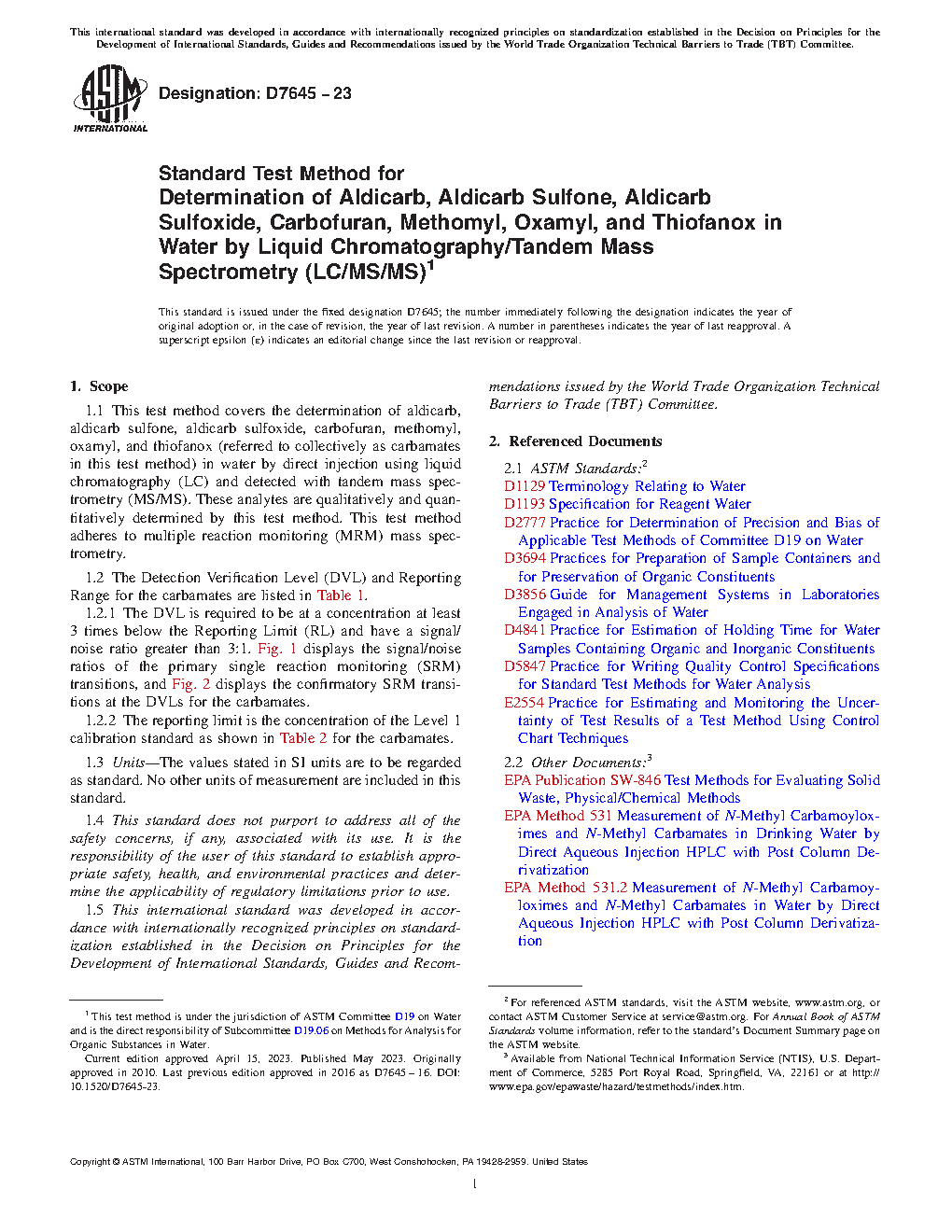 1.2 The Detection Verification Level (DVL) and Reporting Range for the carbamates are listed in Table 1.