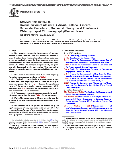 1.1 This test method covers the determination of aldicarb, aldicarb sulfone, aldicarb sulfoxide, carbofuran, methomyl, oxamyl, and thiofanox (referred to collectively as carbamates in this test method) in water by direct injection using liquid chromatography (LC) and detected with tandem mass spectrometry (MS/MS). These analytes are qualitatively and quantitatively determined by this test method. This test method adheres to multiple reaction monitoring (MRM) mass spectrometry.