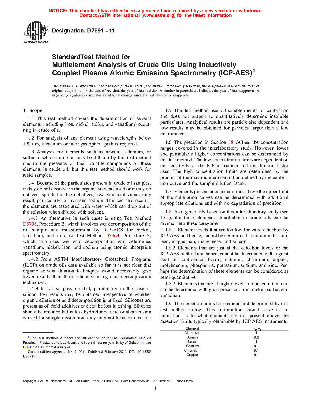 1.9 The detection limits for elements not determined by this test method follow. This information should serve as an indication as to what elements are not present above the detection limits typically obtainable by ICP-AES instruments.