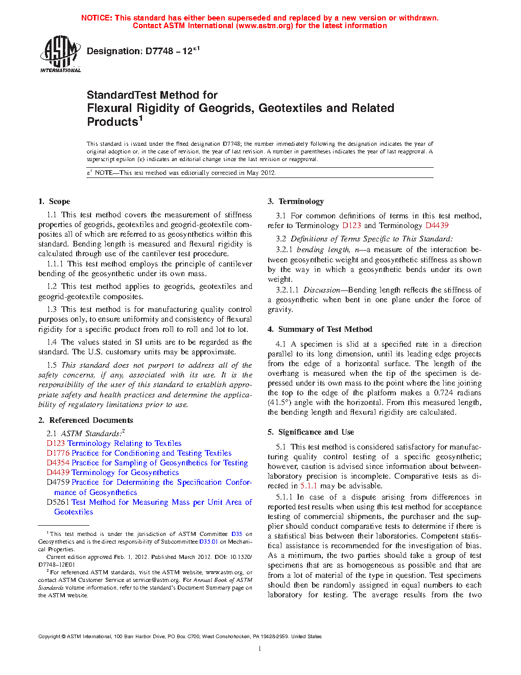 1.1 This test method covers the measurement of stiffness properties of geogrids, geotextiles and geogrid-geotextile composites all of which are referred to as geosynthetics within this test method. Bending length is measured and flexural rigidity is calculated through use of the cantilever test procedure.