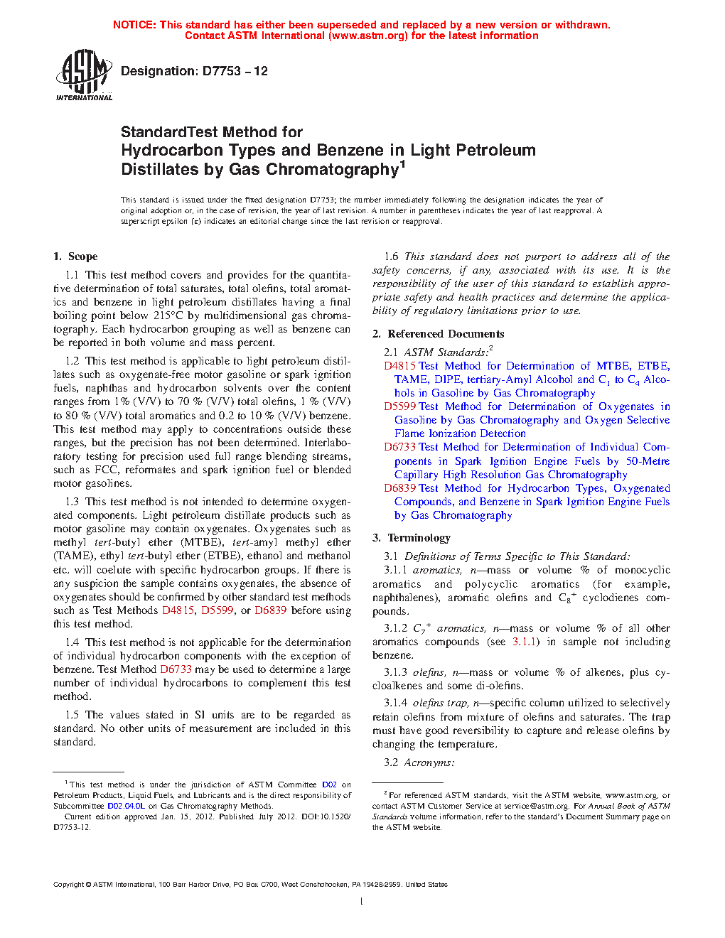 1.3 This test method is not intended to determine oxygenated components. Light petroleum distillate products such as motor gasoline may contain oxygenates. Oxygenates such as methyl tert-butyl ether (MTBE), tert-amyl methyl ether (TAME), ethyl tert-butyl ether (ETBE), ethanol and methanol etc. will coelute with specific hydrocarbon groups. If there is any suspicion the sample contains oxygenates, the absence of oxygenates should be confirmed by other standard test methods such as Test Methods D4815, D5599, or D6839 before using this test method.