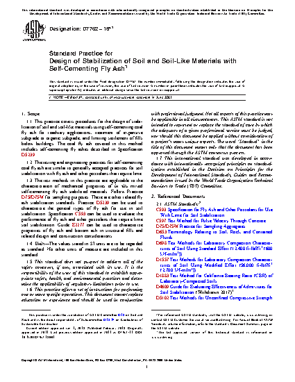 1.3 The test methods in this practice are applicable to the characterization of mechanical properties of in situ mixed self-cementing fly ash stabilized materials. Follow Practice D75 for sampling purposes. There are other related fly ash stabilization standards. Practice D5239 can be used to characterize the general types of fly ash for use in soil stabilization. Specification C593 can be used to evaluate the performance of fly ash and other pozzolans that require lime soil stabilization. Guide E2277 can be used to characterize properties of fly ash and bottom ash in structural fills and related design and construction considerations.
