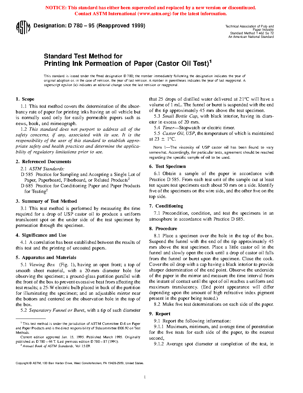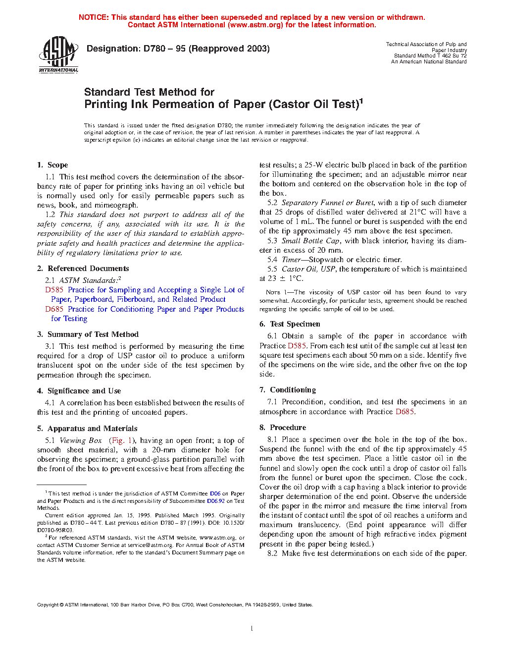 Standard Test Method for Printing Ink Permeation of Paper (Castor Oil Test) (Withdrawn 2009)