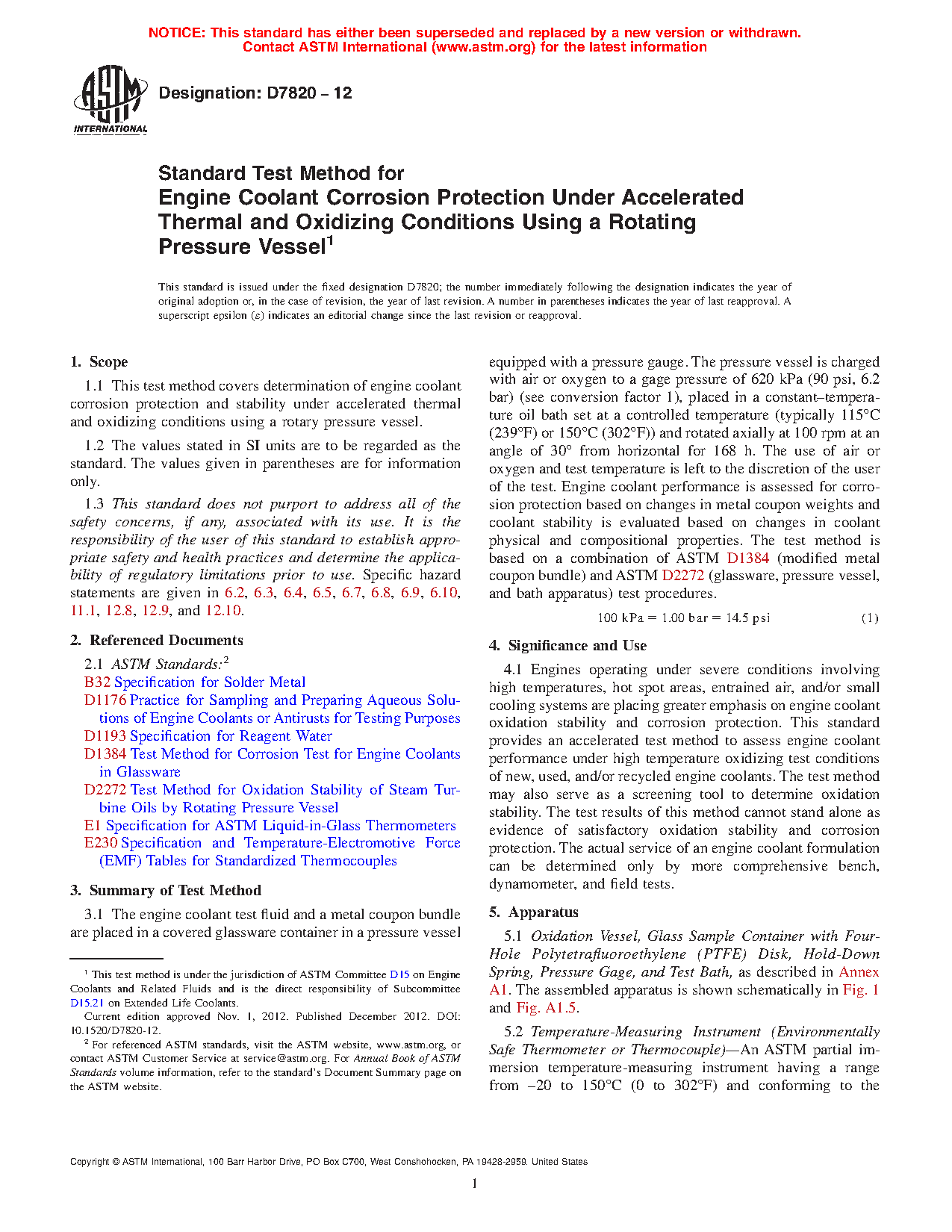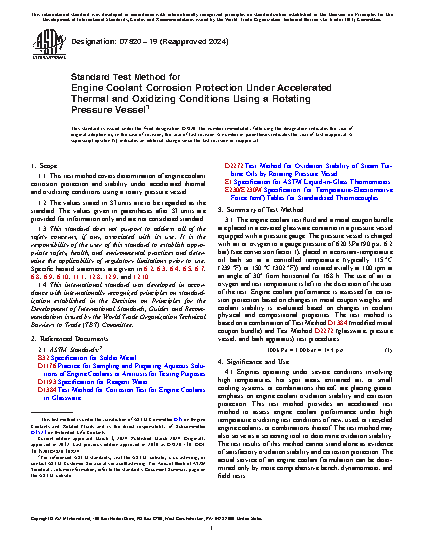 1.1 This test method covers determination of engine coolant corrosion protection and stability under accelerated thermal and oxidizing conditions using a rotary pressure vessel.