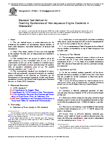 1.1 This test method covers a simple glassware test for evaluating the tendency of non-aqueous engine coolants to foam under laboratory controlled conditions of aeration and temperature.