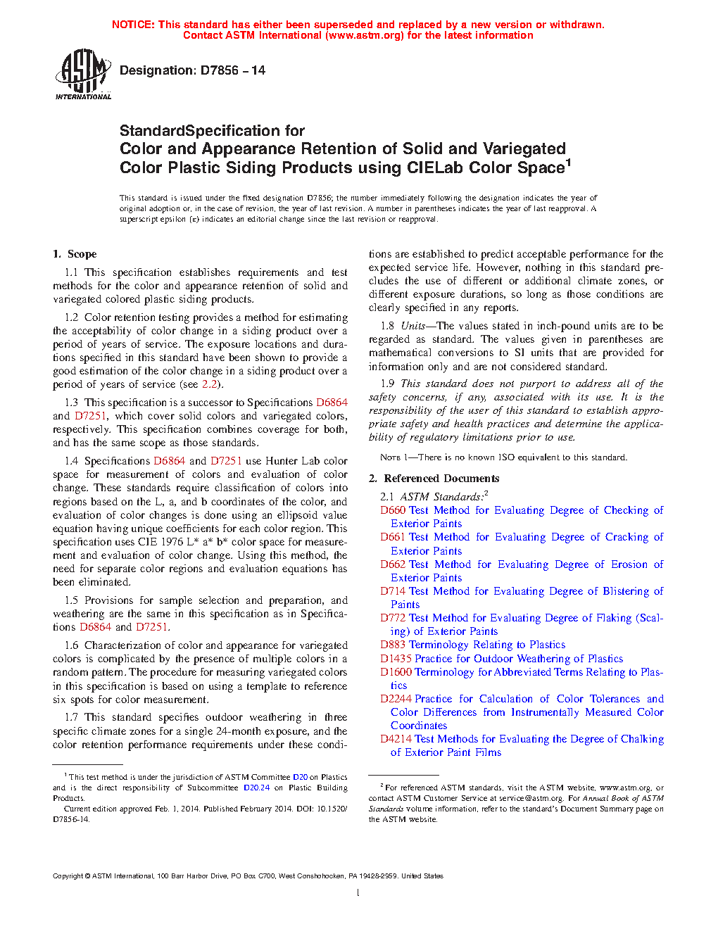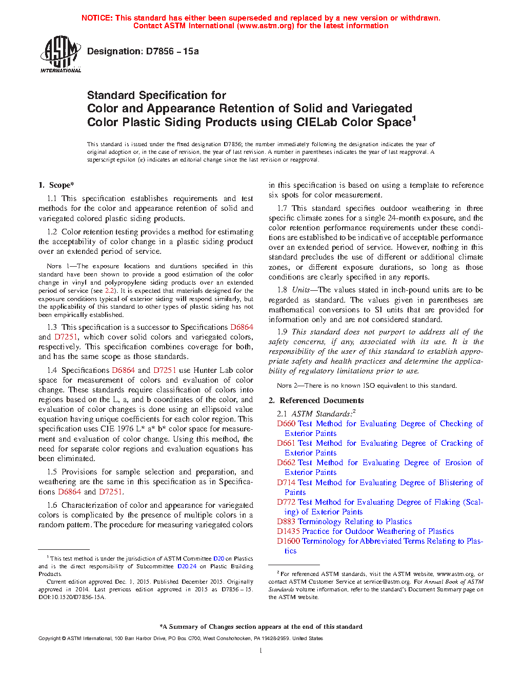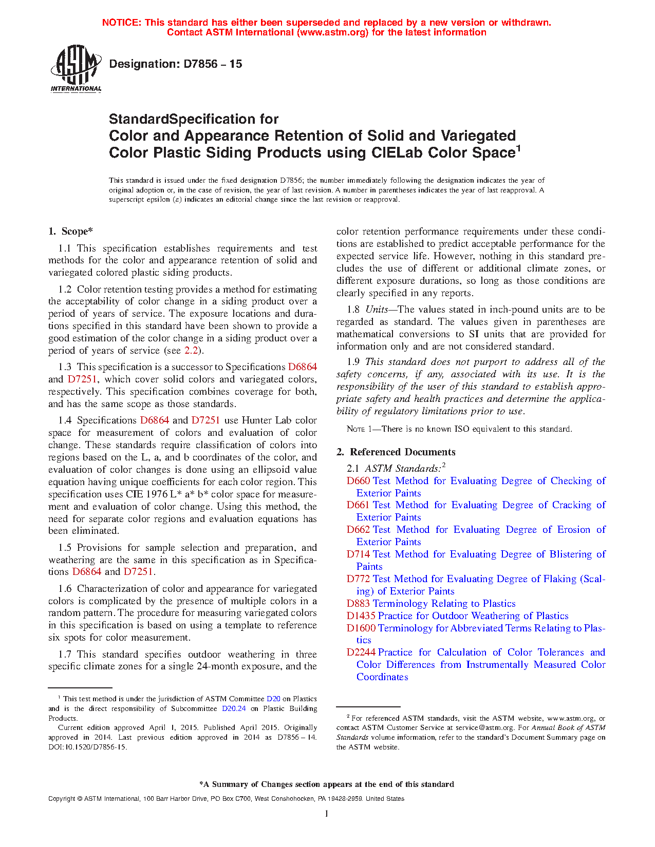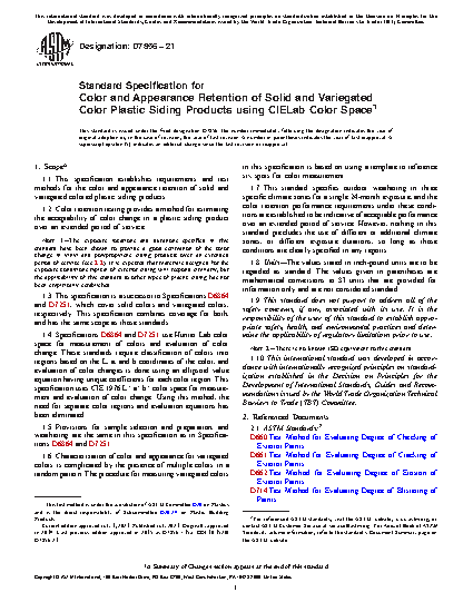 1.1 This specification establishes requirements and test methods for the color and appearance retention of solid and variegated colored plastic siding products.