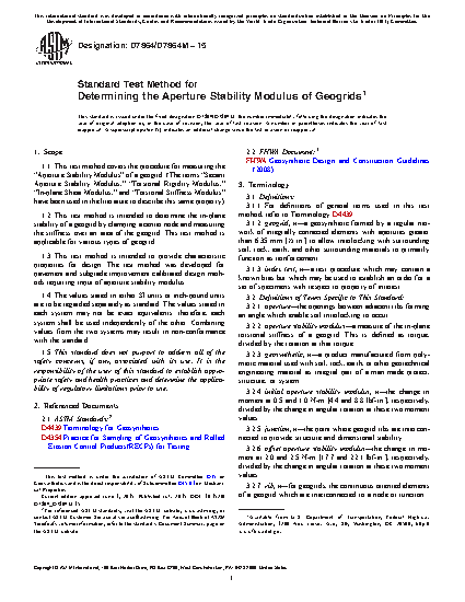 1.1 This test method covers the procedure for measuring the “Aperture Stability Modulus” of a geogrid. (The terms “Secant Aperture Stability Modulus,” “Torsional Rigidity Modulus,” “In-plane Shear Modulus,” and “Torsional Stiffness Modulus” have been used in the literature to describe this same property.)
