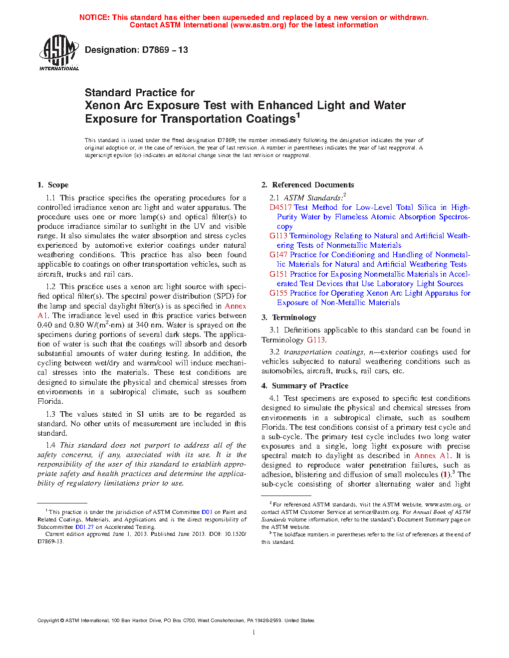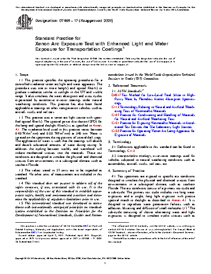 1.1 This practice specifies the operating procedures for a controlled irradiance xenon arc light and water apparatus. The procedure uses one or more lamp(s) and optical filter(s) to produce irradiance similar to sunlight in the UV and visible range. It also simulates the water absorption and stress cycles experienced by automotive exterior coatings under natural weathering conditions. This practice has also been found applicable to coatings on other transportation vehicles, such as aircraft, trucks and rail cars.