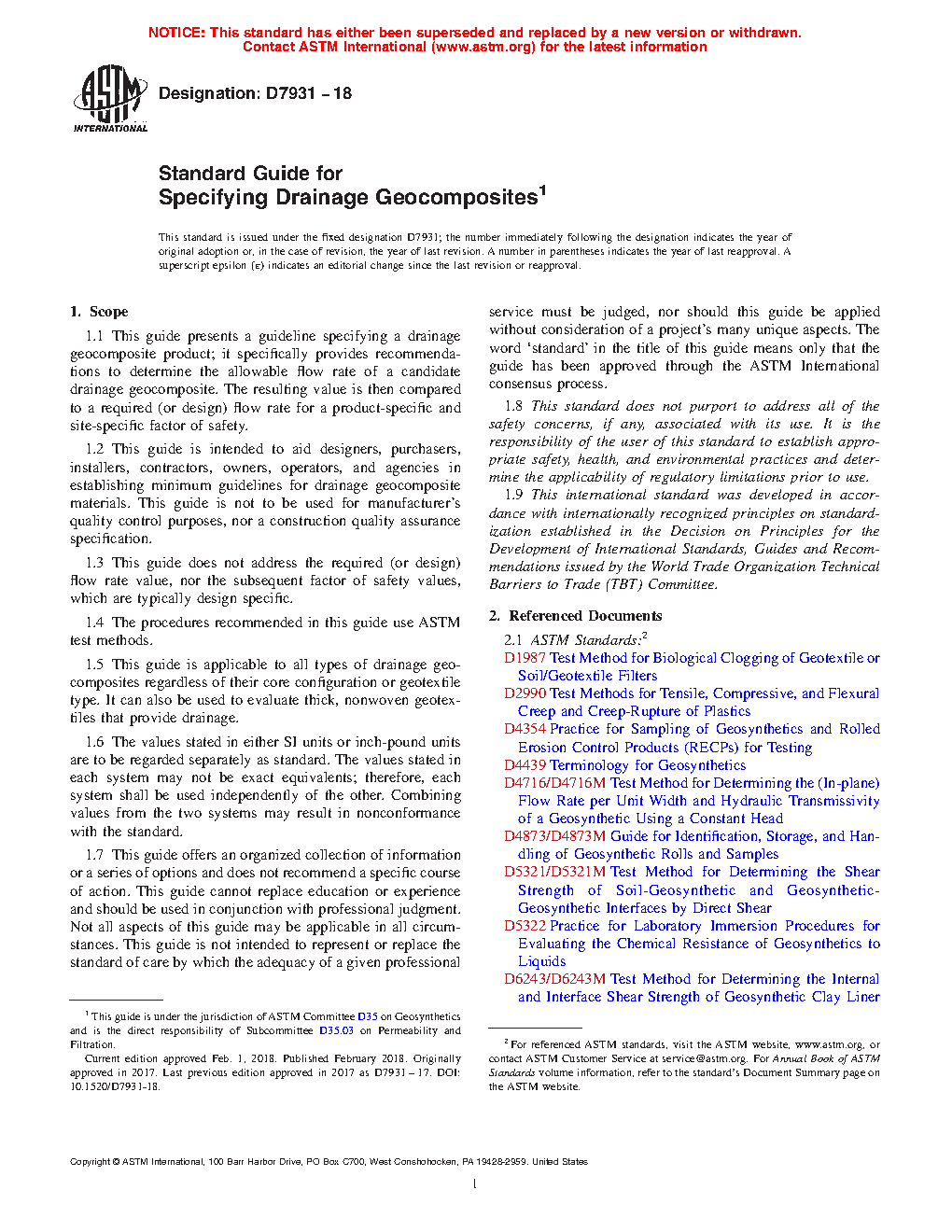 1.2 This guide is intended to aid designers, purchasers, installers, contractors, owners, operators, and agencies in establishing minimum guidelines for drainage geocomposite materials. This guide is not to be used for manufacturer’s quality control purposes, nor a construction quality assurance specification.