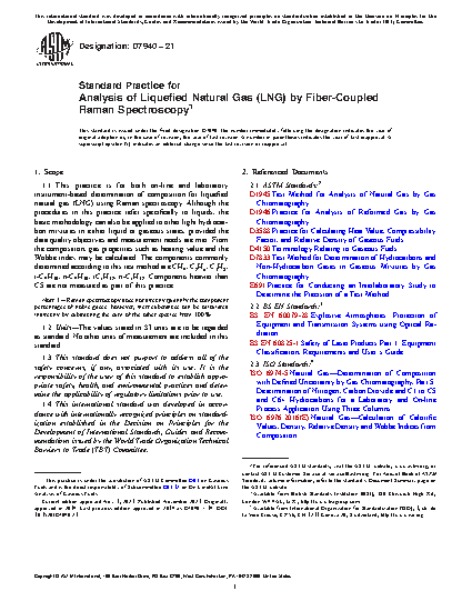 1.1 This practice is for both on-line and laboratory instrument-based determination of composition for liquefied natural gas (LNG) using Raman spectroscopy. Although the procedures in this practice refer specifically to liquids, the basic methodology can also be applied to other light hydrocarbon mixtures in either liquid or gaseous states, provided the data quality objectives and measurement needs are met. From the composition, gas properties such as heating value and the Wobbe index may be calculated. The components commonly determined according to this test method are CH4, C2H6, C3H8, i-C4H10, n-C4H10, iC5H12, n-C5H12. Components heavier than C5 are not measured as part of this practice.