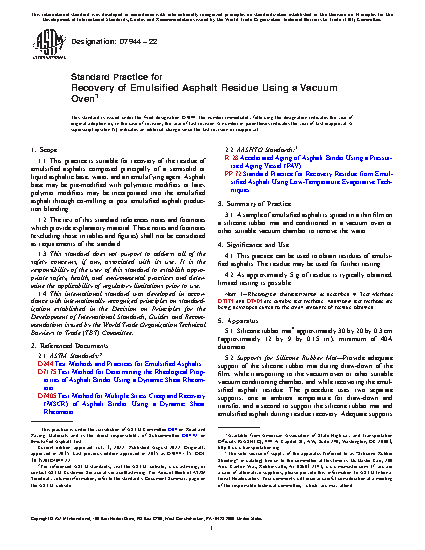 1.1 This practice is suitable for recovery of the residue of emulsified asphalts composed principally of a semisolid or liquid asphaltic base, water and an emulsifying agent. Asphalt base may be pre-modified with polymeric modifiers or latex polymer modifiers may be incorporated into the emulsified asphalt through co-milling or post emulsified asphalt production blending.