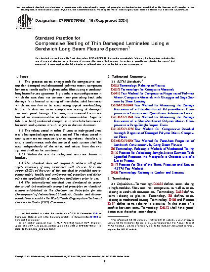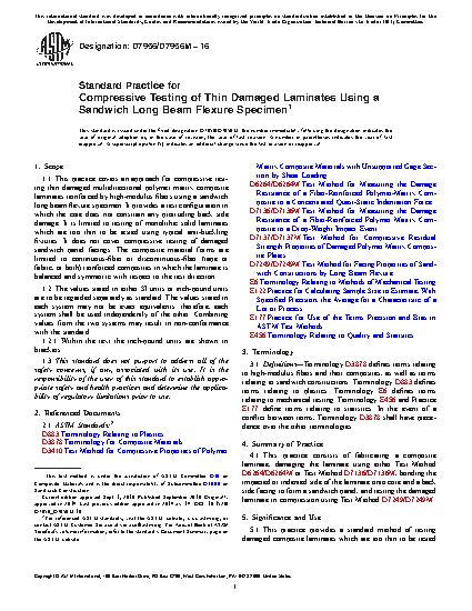 1.1 This practice covers an approach for compressive testing thin damaged multidirectional polymer matrix composite laminates reinforced by high-modulus fibers using a sandwich long beam flexure specimen. It provides a test configuration in which the core does not constrain any protruding back side damage. It is limited to testing of monolithic solid laminates which are too thin to be tested using typical anti-buckling fixtures. It does not cover compressive testing of damaged sandwich panel facings. The composite material forms are limited to continuous-fiber or discontinuous-fiber (tape or fabric, or both) reinforced composites in which the laminate is balanced and symmetric with respect to the test direction
