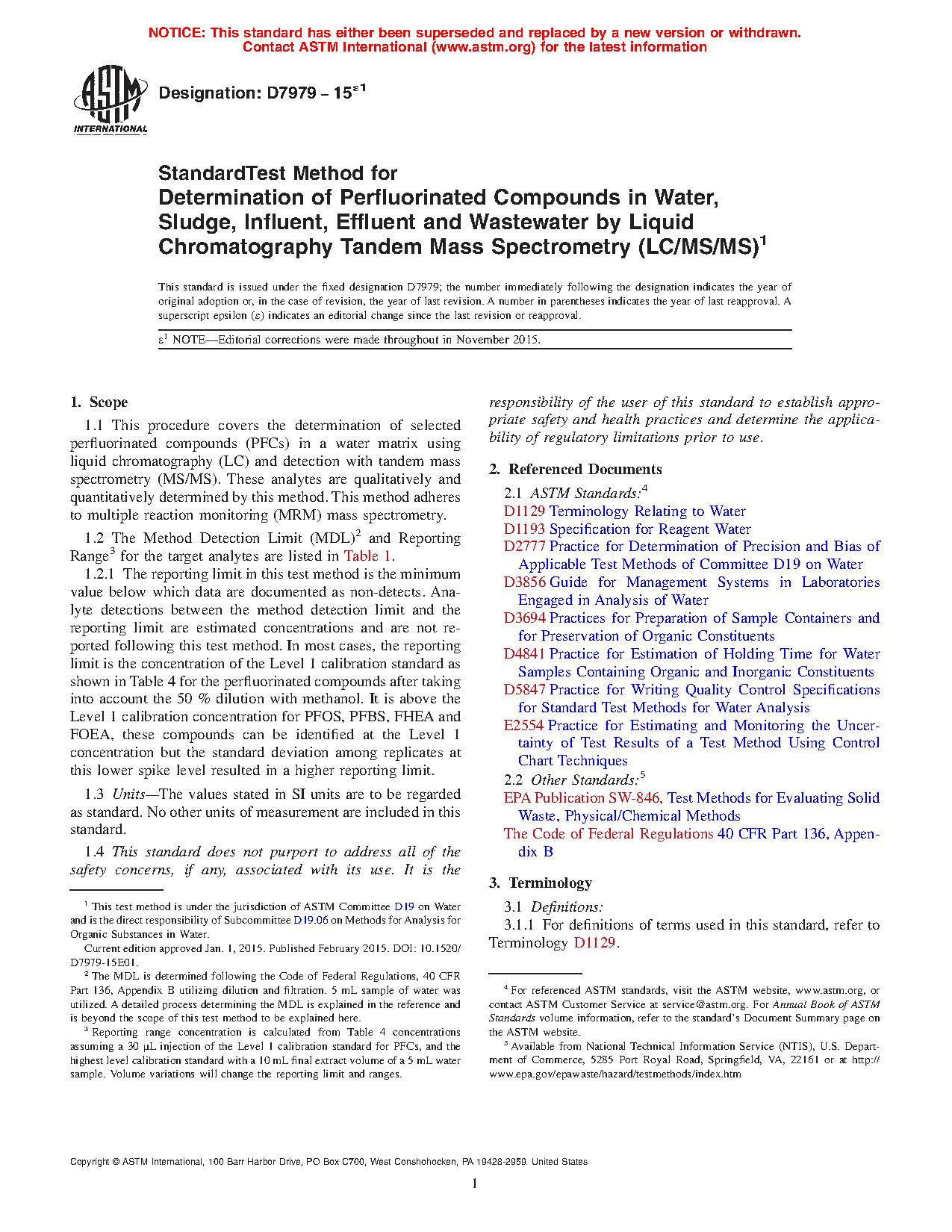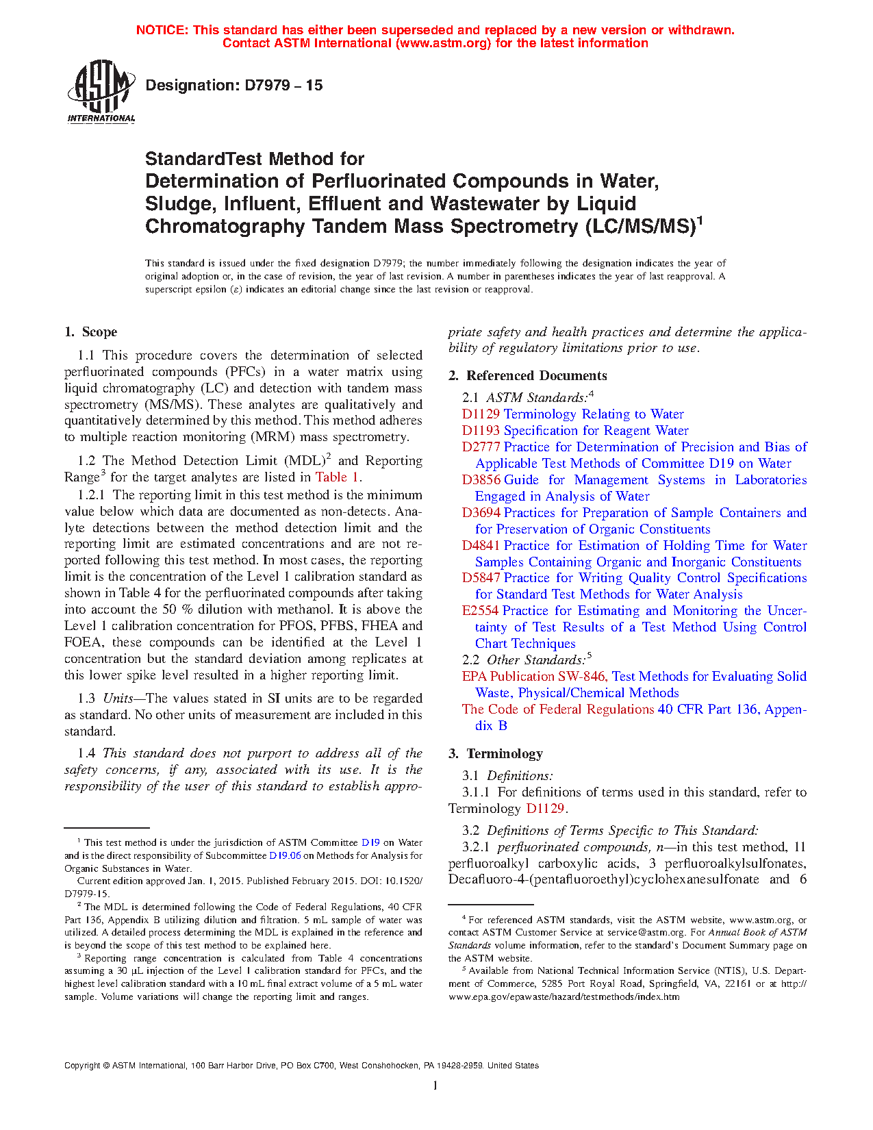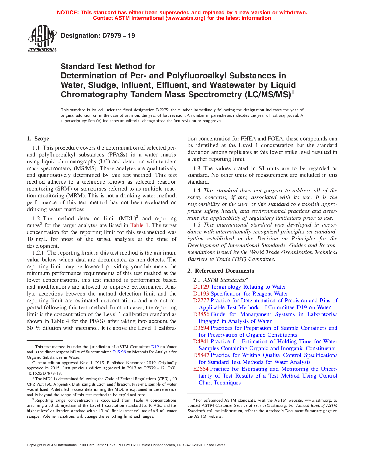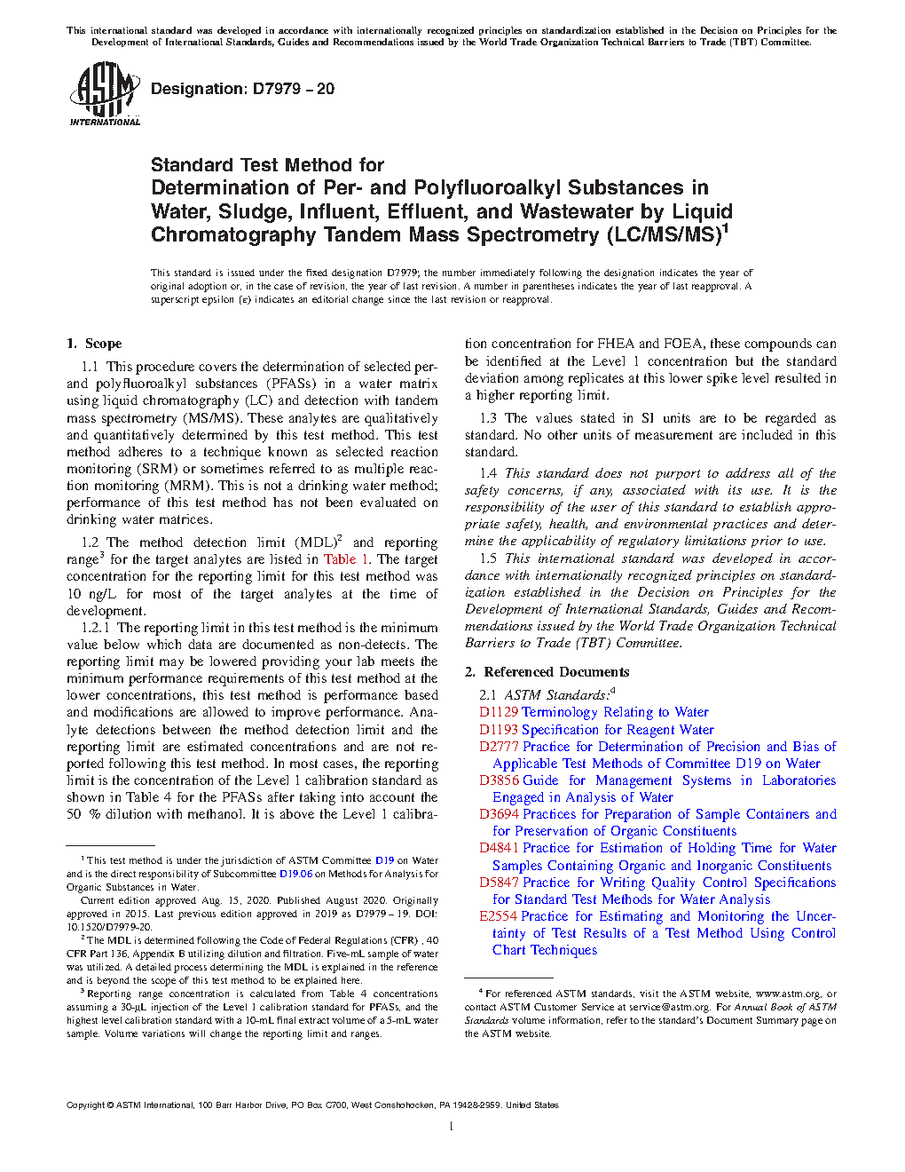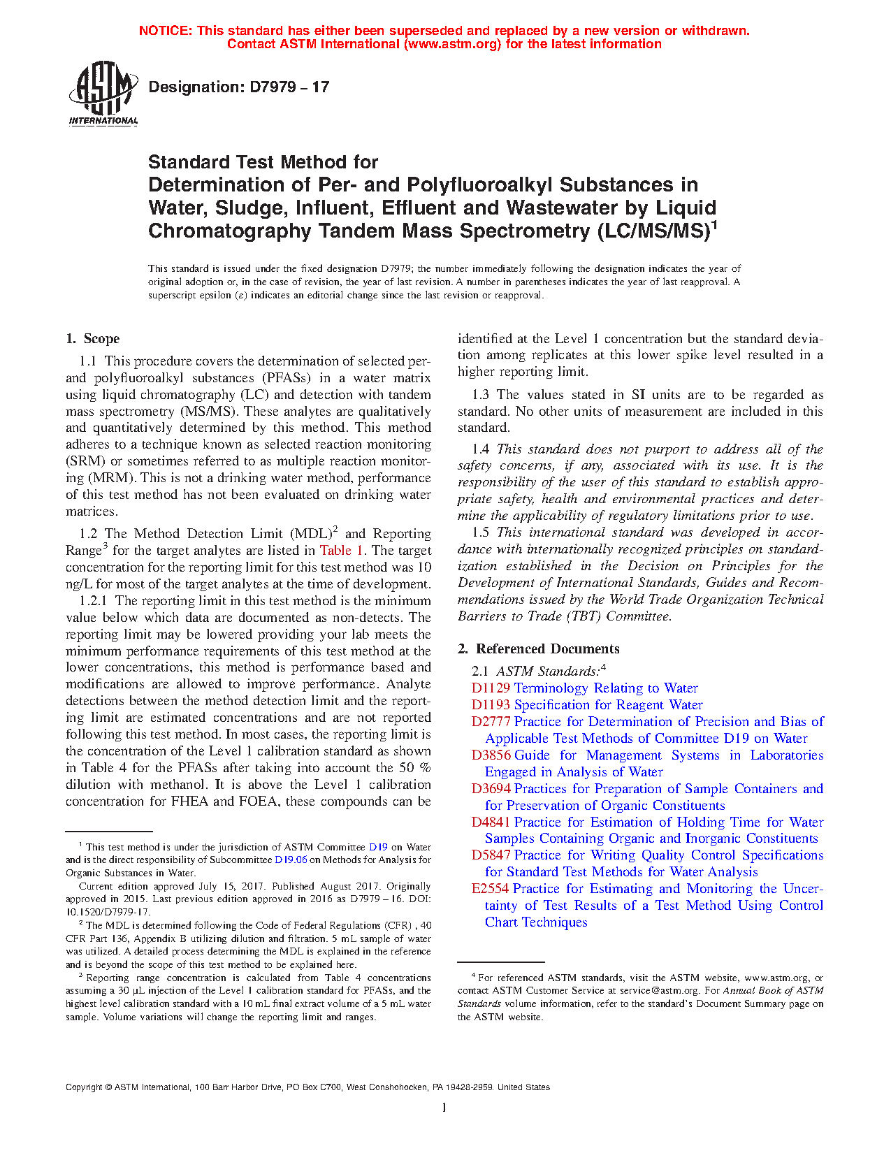 1.1 This procedure covers the determination of selected per- and polyfluoroalkyl substances (PFASs) in a water matrix using liquid chromatography (LC) and detection with tandem mass spectrometry (MS/MS). These analytes are qualitatively and quantitatively determined by this method. This method adheres to a technique known as selected reaction monitoring (SRM) or sometimes referred to as multiple reaction monitoring (MRM). This is not a drinking water method, performance of this test method has not been evaluated on drinking water matrices.