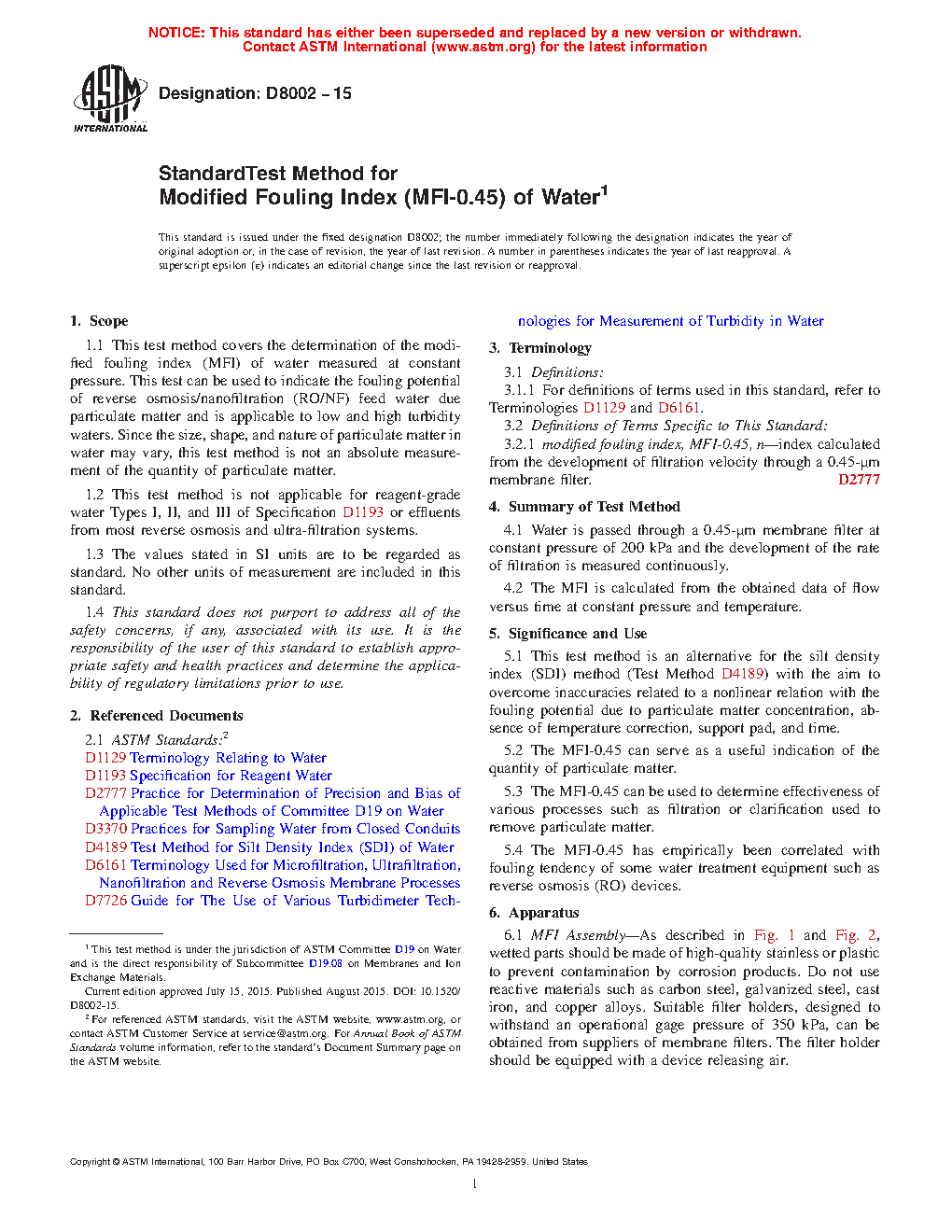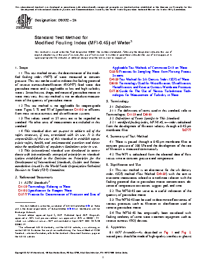 1.1 This test method covers the determination of the modified fouling index (MFI) of water measured at constant pressure. This test can be used to indicate the fouling potential of reverse osmosis/nanofiltration (RO/NF) feed water due particulate matter and is applicable to low and high turbidity waters. Since the size, shape, and nature of particulate matter in water may vary, this test method is not an absolute measurement of the quantity of particulate matter.