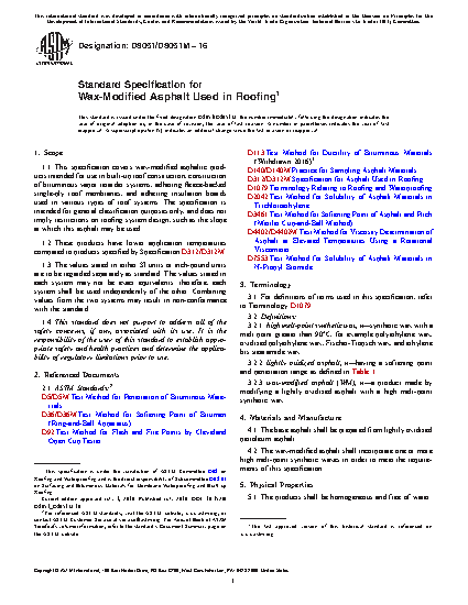 This specification establishes the manufacturing process and physical requirements for wax-modified asphaltic products intended for built-up roof construction, construction of bituminous vapor retarder systems, adhering fleece-backed single-ply roof membranes, and adhering insulation boards used in various types of roof systems. The base asphalt shall be prepared from lightly oxidized petroleum asphalt, and the wax-modified asphalt shall incorporate one or more high melt-point synthetic waxes. Furthermore, the products shall be homogeneous and free of water.