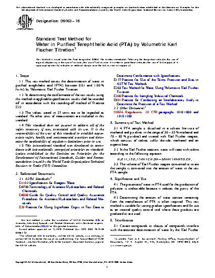 1.1 This test method covers the determination of water in purified terephthalic acid (PTA) between 0.01 and 1.00 % (w/w) by Volumetric Karl Fischer Titration.