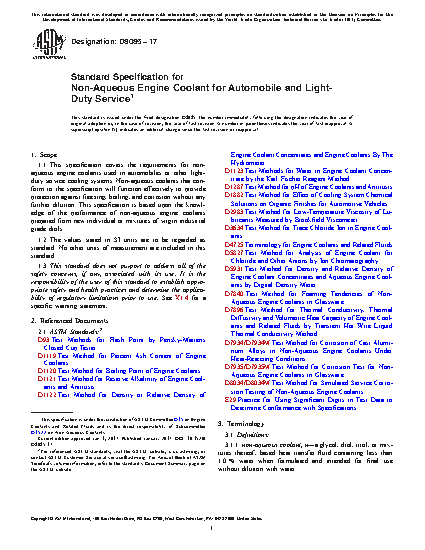 This specification establishes the requirements for nonaqueous engine coolants used in automobiles or other lightduty service cooling systems. Non-aqueous coolants that conform to the specification will function effectively to provide protection against freezing, boiling, and corrosion without any further dilution. This specification is based upon the knowledge of the performance of non-aqueous engine coolants prepared from new individual or mixtures of virgin industrial grade diols.