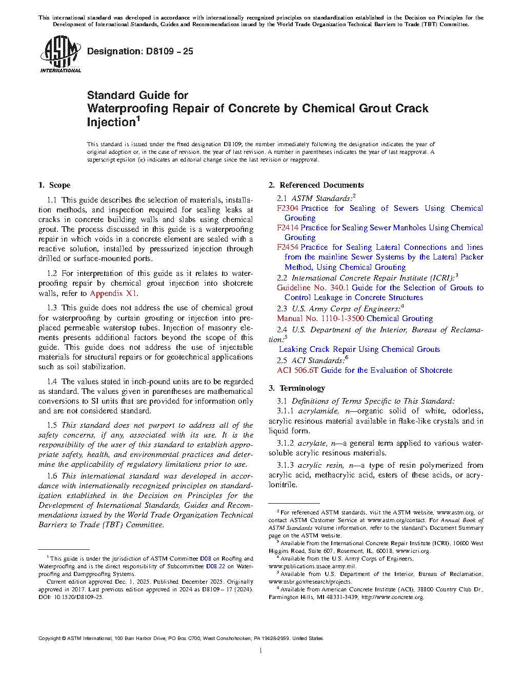 1.1 This guide describes the selection of materials, installation methods, and inspection required for sealing leaks at cracks in concrete building walls and slabs using chemical grout. The process discussed in this guide is a waterproofing repair in which voids in a concrete element are sealed with a reactive solution, installed by pressurized injection through drilled or surface-mounted ports.
