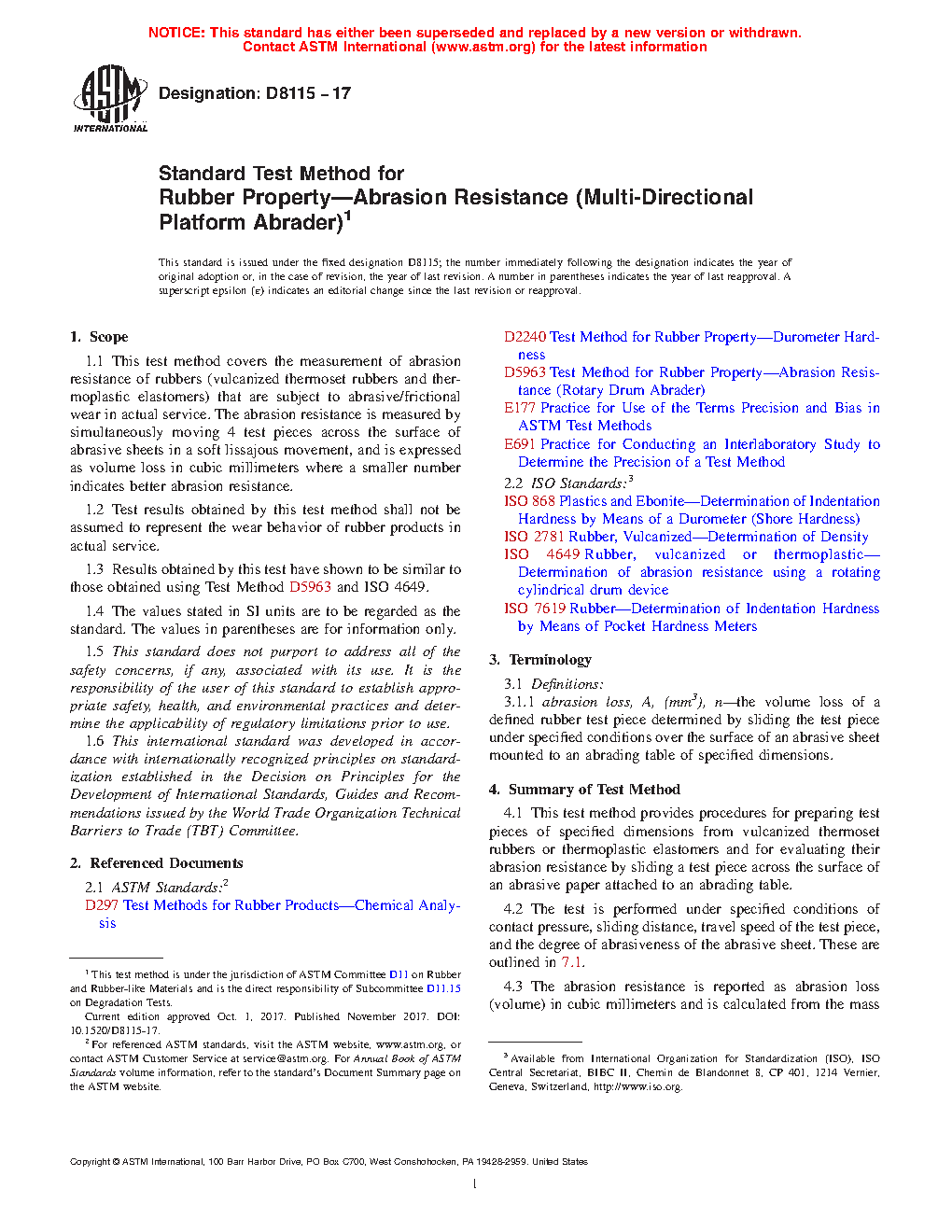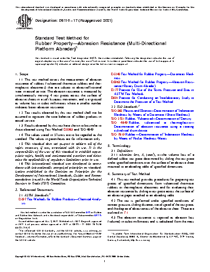 1.1 This test method covers the measurement of abrasion resistance of rubbers (vulcanized thermoset rubbers and thermoplastic elastomers) that are subject to abrasive/frictional wear in actual service. The abrasion resistance is measured by simultaneously moving 4 test pieces across the surface of abrasive sheets in a soft lissajous movement, and is expressed as volume loss in cubic millimeters where a smaller number indicates better abrasion resistance.