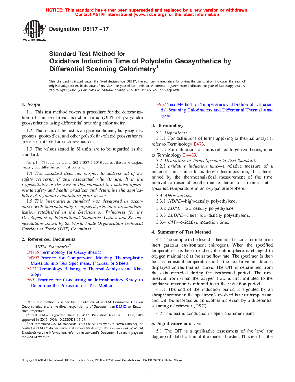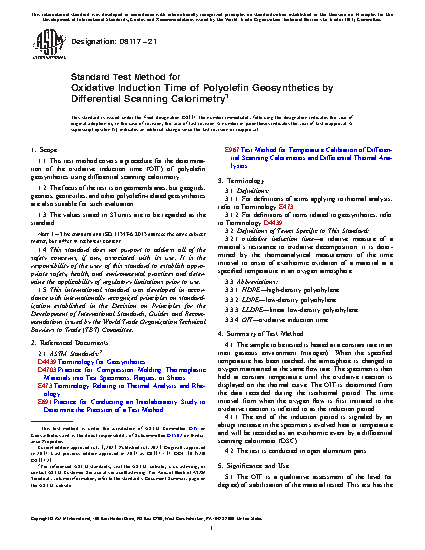1.1 This test method covers a procedure for the determination of the oxidative induction time (OIT) of polyolefin geosynthetics using differential scanning calorimetry.
