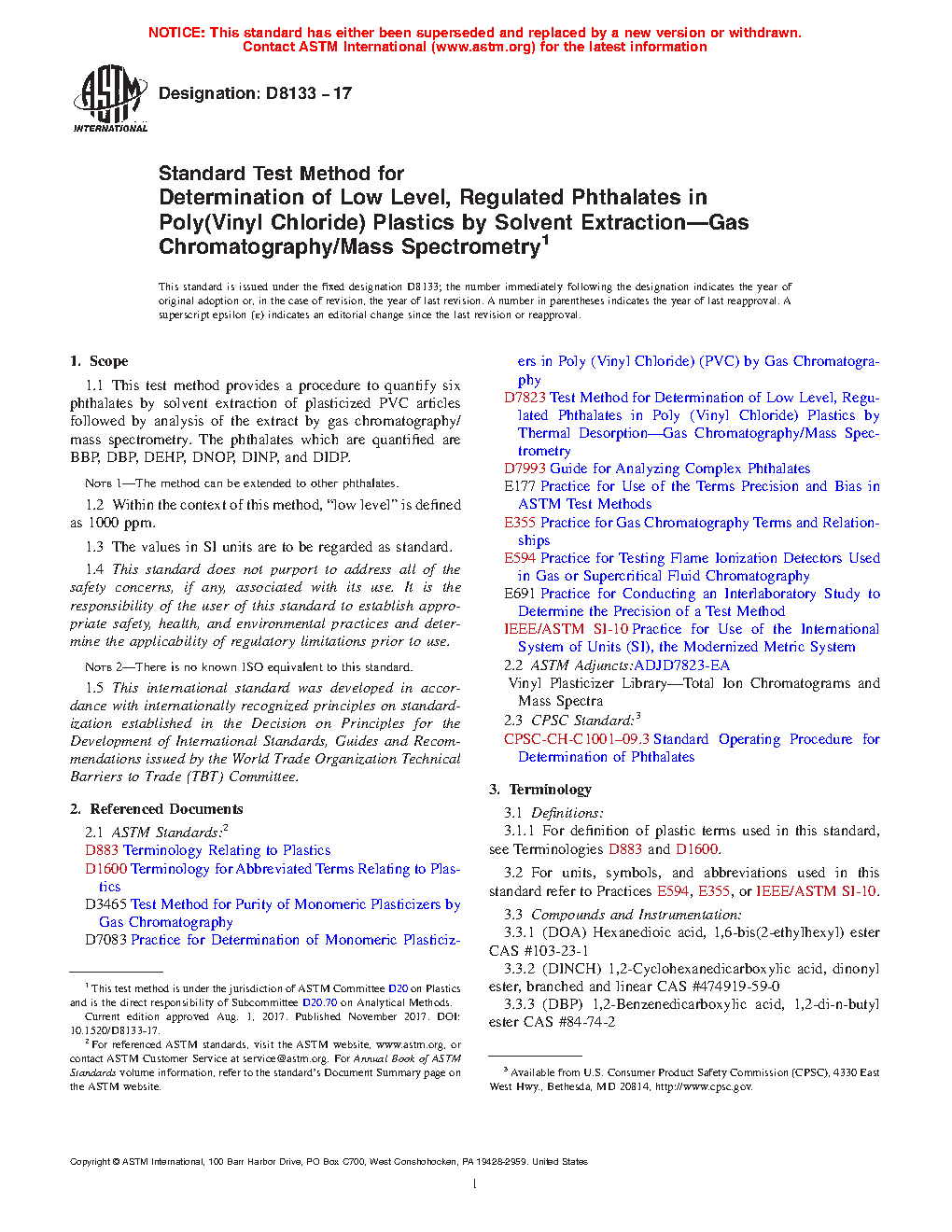 5.1 Identification and Quantification of Phthalates—DBP, BBP, DEHP, DNOP, DINP and DIDP are representative of the phthalates either banned or being monitored by a variety of regulations. Regulations include: EU—Directive 2005/84/EC, US—Consumer Product Safety Improvement Act of 2008 – section 108, Japan—Health, Labor and Welfare Ministry guideline No. 336 (2010) and IEC 62321-8:2017. These test methods provide a procedure to identify and quantify phthalates in PVC.