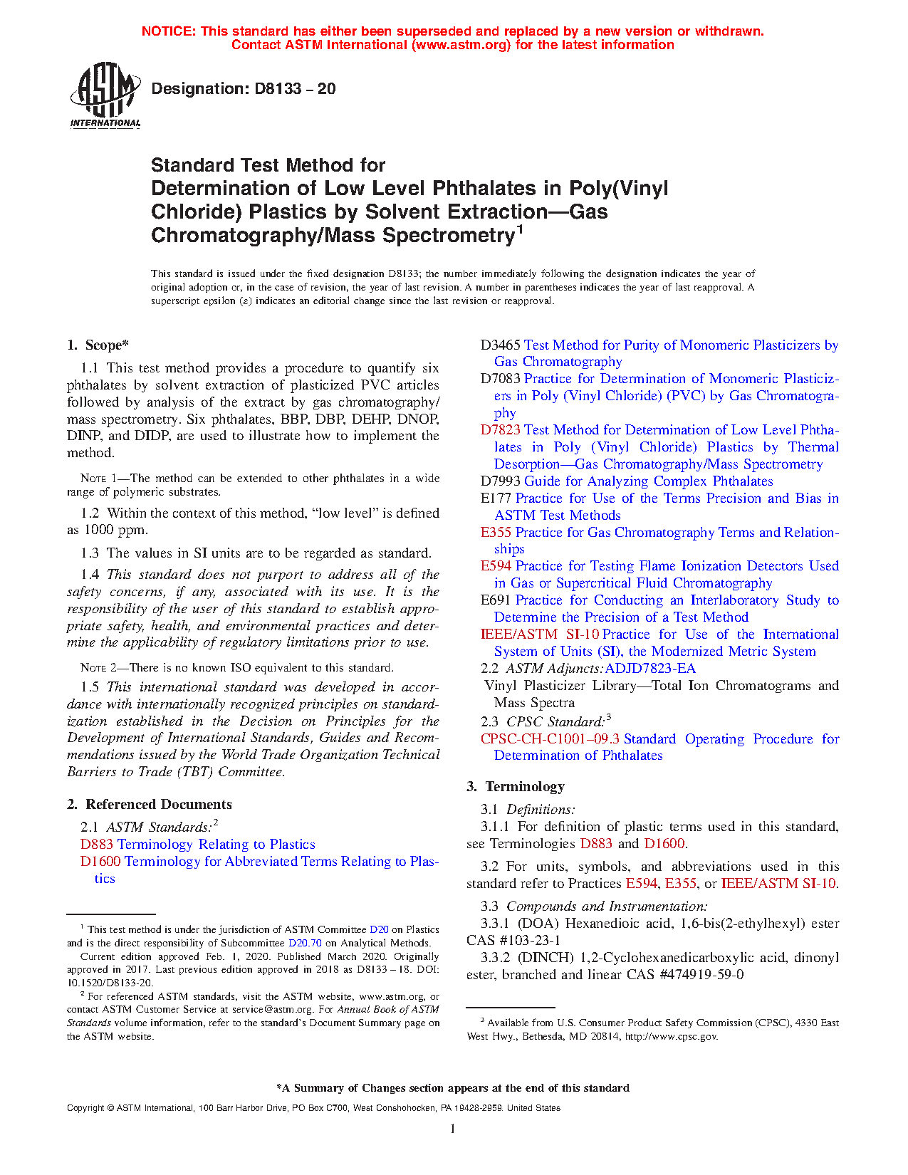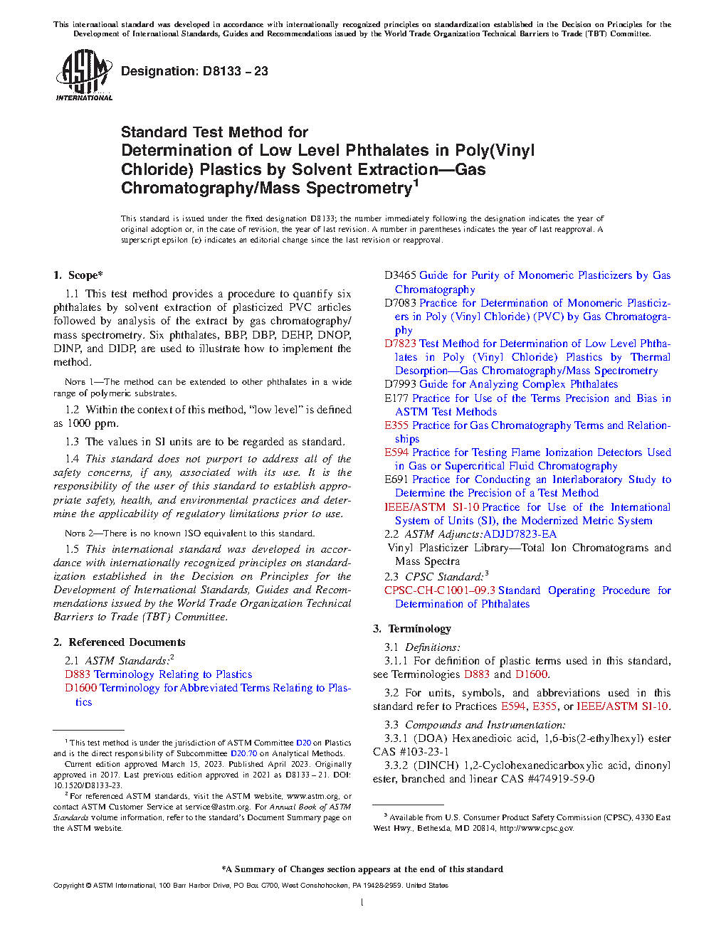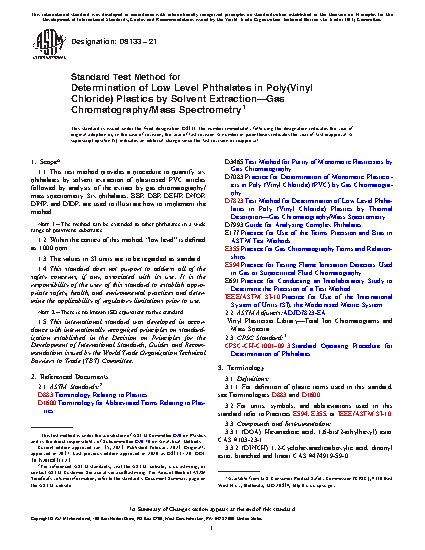 1.1 This test method provides a procedure to quantify six phthalates by solvent extraction of plasticized PVC articles followed by analysis of the extract by gas chromatography/mass spectrometry. Six phthalates, BBP, DBP, DEHP, DNOP, DINP, and DIDP, are used to illustrate how to implement the method.