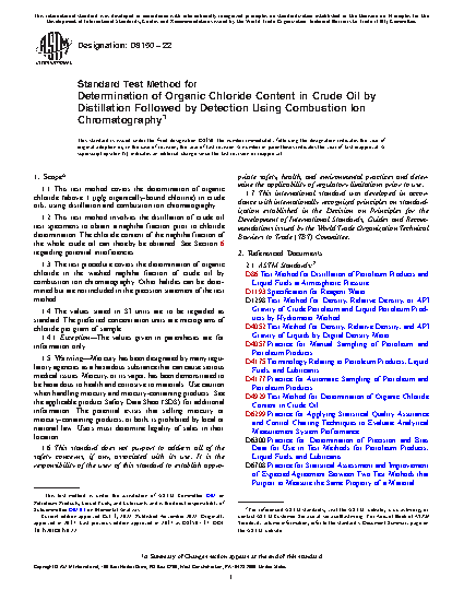 1.2 This test method involves the distillation of crude oil test specimens to obtain a naphtha fraction prior to chloride determination. The chloride content of the naphtha fraction of the whole crude oil can thereby be obtained. See Section 5 regarding potential interferences.