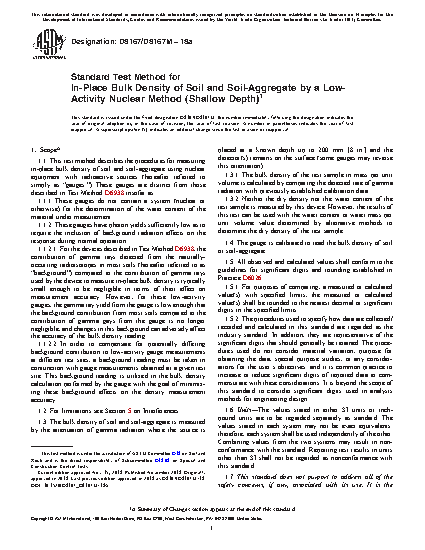 1.1 This test method describes the procedures for measuring in-place bulk density of soil and soil-aggregate using nuclear equipment with radioactive sources (hereafter referred to simply as “gauges.”) These gauges are distinct from those described in Test Method D6938 insofar as: