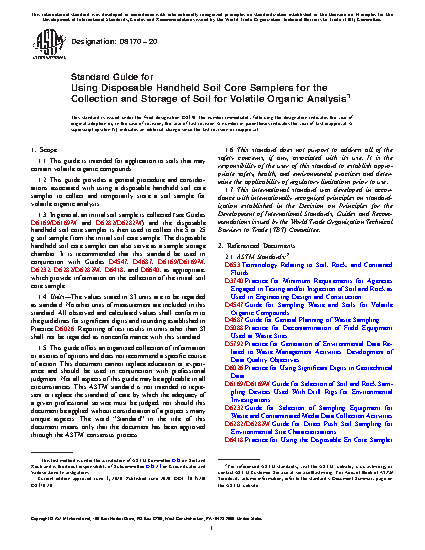 5.1 This guide is for the use of disposable handheld soil core samplers in collecting and storing approximately 5 or 25 g soil samples for volatile organic analysis in a manner that reduces loss of contaminants due to volatilization or biodegradation. In general, an initial soil core sample is collected (see Guides D6169/D6169M and D6282/D6282M) and the disposable handheld soil core sampler is then used to collect the 5 or 25 g soil sample from the initial soil core sample. The disposable handheld soil core sampler can also serve as a sample storage chamber.
