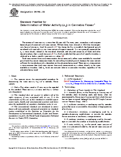 1.1 This practice covers the recommended procedure for determining the water activity (aw) of a cannabis flower sample.