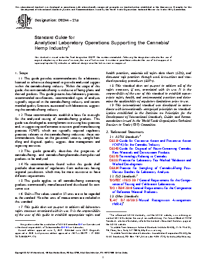 1.1 This guide provides recommendations for a laboratory licensed or otherwise designated to provide analytical support within the cannabis/hemp industry. Within the scope of this guide, the term cannabis/hemp is inclusive of hemp plants and derived products. This guide presents best laboratory practices, recommended certifications, recommended types of analyses typically required in the cannabis/hemp industry, and recommended quality functions associated with laboratories supporting the cannabis/hemp industry.