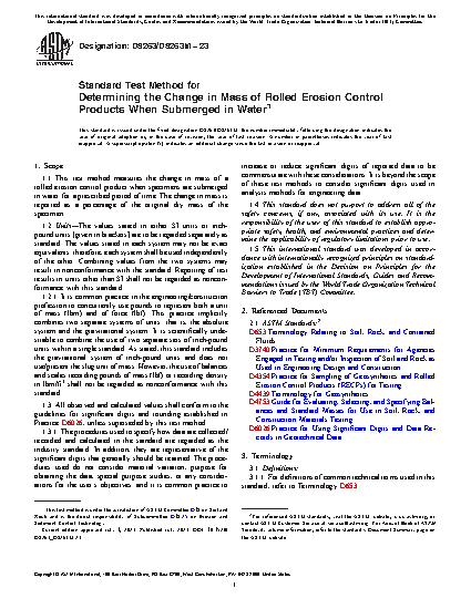 1.1 This test method measures the change in mass of a rolled erosion control product when specimens are submerged in water for a prescribed period of time. The change in mass is reported as a percentage of the original dry mass of the specimen.