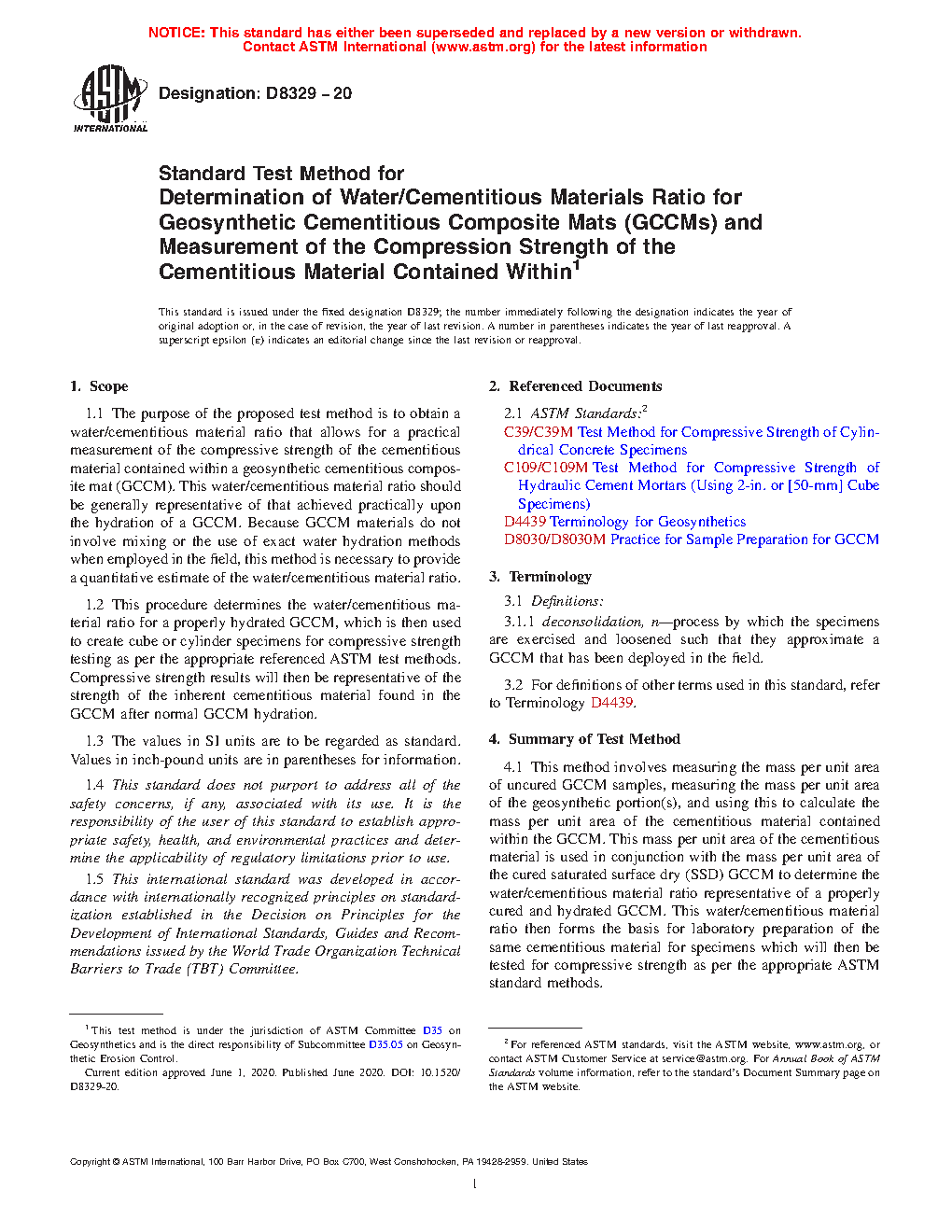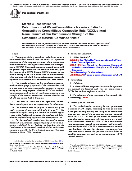 1.1 The purpose of the proposed test method is to obtain a water/cementitious material ratio that allows for a practical measurement of the compressive strength of the cementitious material contained within a geosynthetic cementitious composite mat (GCCM). This water/cementitious material ratio should be generally representative of that achieved practically upon the hydration of a GCCM. Because GCCM materials do not involve mixing or the use of exact water hydration methods when employed in the field, this method is necessary to provide a quantitative estimate of the water/cementitious material ratio.