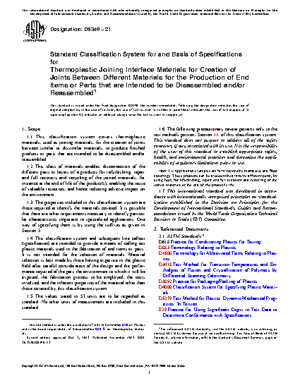 1.1 This classification system covers thermoplastic materials, used as joining materials, for the creation of joints between similar or dissimilar materials, to produce finished products or parts that are intended to be disassembled and/or reassembled.