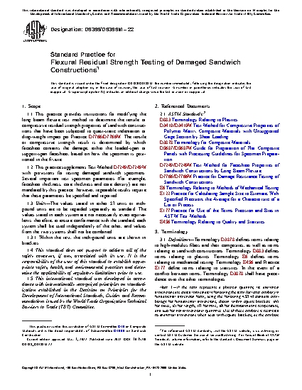 1.1 This practice provides instructions for modifying the long beam flexure test method to determine the tensile or compressive residual strength properties of sandwich constructions that have been subjected to quasi-static indentation or drop-weight impact per Practice D7766/D7766M. The tensile or compressive strength result is determined by which facesheet contains the damage, either the loaded-span or support-span facesheet, based on how the specimen is positioned in the fixture.