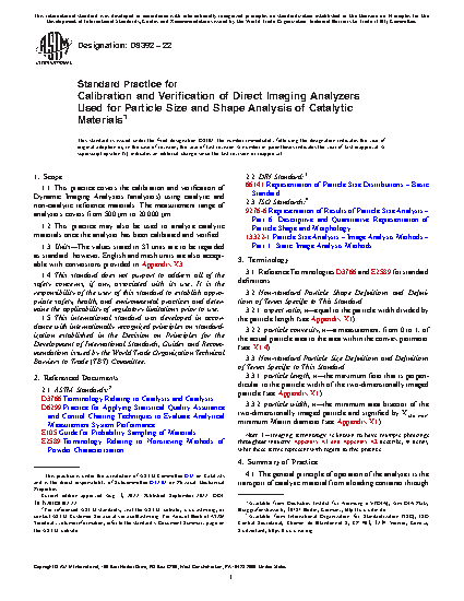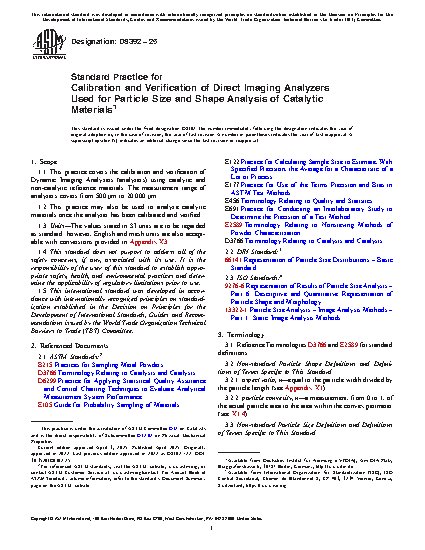 1.1 This practice covers the calibration and verification of Dynamic Imaging Analyzers (analyzers) using catalytic and non-catalytic reference materials. The measurement range of analyzers covers from 500 µm to 20 000 µm.