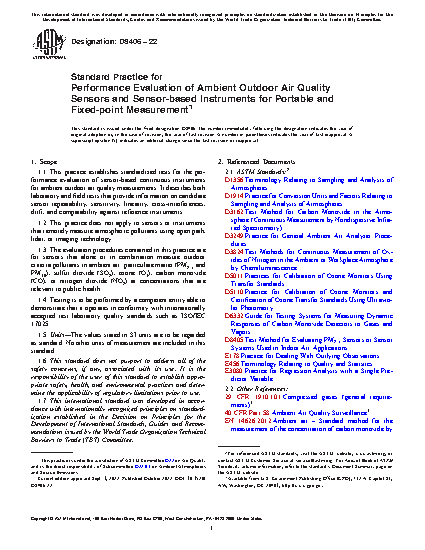5.1 This practice establishes standardized tests for the performance evaluation of sensor-based continuous instruments for ambient air quality measurements. Public and private air monitoring interests have manifested themselves as a driving force for the deployment of air quality sensors and instruments to quantify air pollutant concentrations in communities, around schools, around industrial facilities, and elsewhere. Users of air quality sensors require information on the performance and limitations of these devices so that informed decisions regarding their suitability for various purposes can be determined. This practice describes both laboratory and field tests that provide information on candidate instrument repeatability, sensitivity, linearity, cross-interferences, drift and comparability with more costly instruments typically used by entities such as government agencies. The air quality sensors are first evaluated in a laboratory chamber by comparing their response to a reference instrument and challenging the gas sensors with interferents. The sensors are then deployed outdoors for field testing at two sites with different climates against reference air quality instruments. This practice is intended to be referenced in standards and codes that establish minimum performance quality for sensor-based ambient outdoor air monitoring.