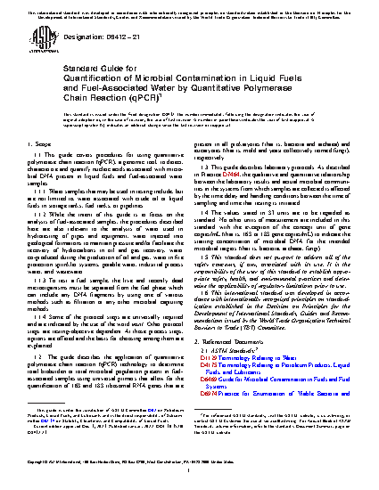 5.8 Since the early 2000s, qPCR methodology has evolved and is now frequently used to quantify microorganisms in fuel-associated samples, but there is currently no standardized methodology for employing qPCR for this application (1-6).3 The purpose of this guide is to provide guidance and standardization for genetic testing of samples using qPCR to quantify total microbial populations present in fuel-associated samples.