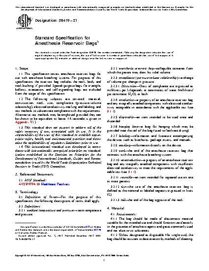 1.1 This specification covers anesthesia reservoir bags for use with anesthesia breathing systems. For purposes of this specification, the reservoir bag includes the neck, body, and neck bushing, if provided. Special-purpose bags, for example, bellows, evacuation, and self-expanding bags are excluded from the scope of this specification.