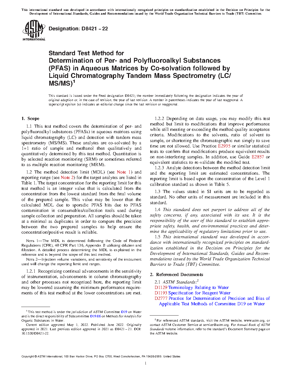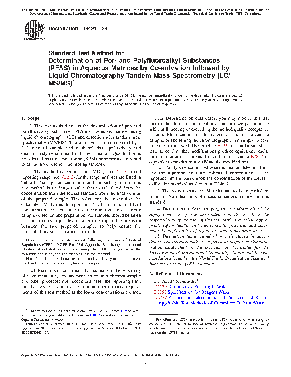 1.2 The method detection limit (MDL) (see Note 1) and reporting range (see Note 2) for the target analytes are listed in Table 1. The target concentration for the reporting limit for this test method is an integer value that is calculated from the concentration from the lowest standard from the final volume of the prepared sample. This value may be lower than the calculated MDL due to sporadic PFAS hits due to PFAS contamination in consumables/collection tools used during sample collection and preparation. All samples should be taken at a minimal as duplicates in order to compare the precision between the two prepared samples to help ensure the concentration/positive result is reliable.