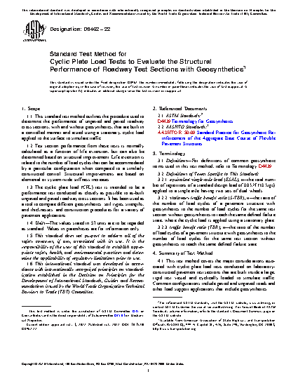 1.1 This standard test method outlines the procedure used to determine the performance of unpaved and paved roadway cross sections, with and without geosynthetics, that are built in a controlled manner and tested using a stationary, cyclic load applied to the surface to simulate traffic.