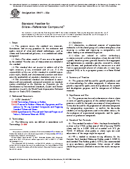 1.1 This practice covers the standard raw materials, formulation, and mixing procedure for the evaluation and quality control of silica and related technologies, such as silanes and functionalized polymers, in a standardized rubber compound.