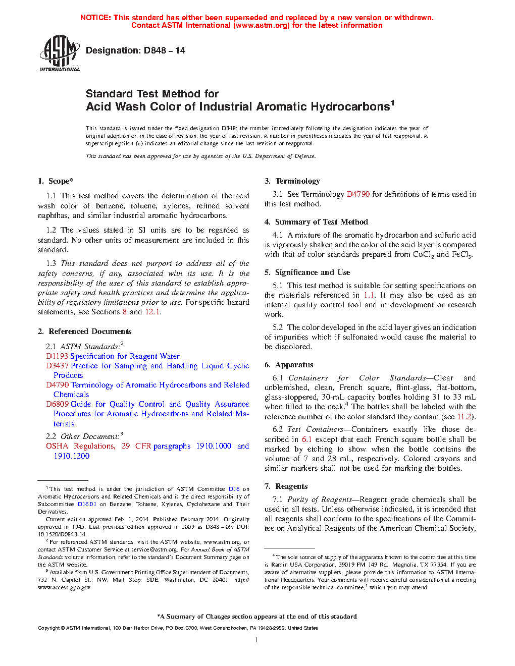 1.1 This test method covers the determination of the acid wash color of benzene, toluene, xylenes, refined solvent naphthas, and similar industrial aromatic hydrocarbons.