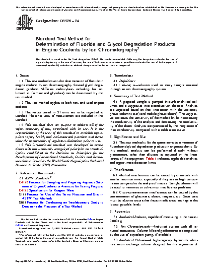 1.1 This test method covers the determination of fluoride in engine coolants by ion chromatography. Several glycol degradation products (different carboxylates including, but not limited to, formate and glycolate) can be determined by this test method.