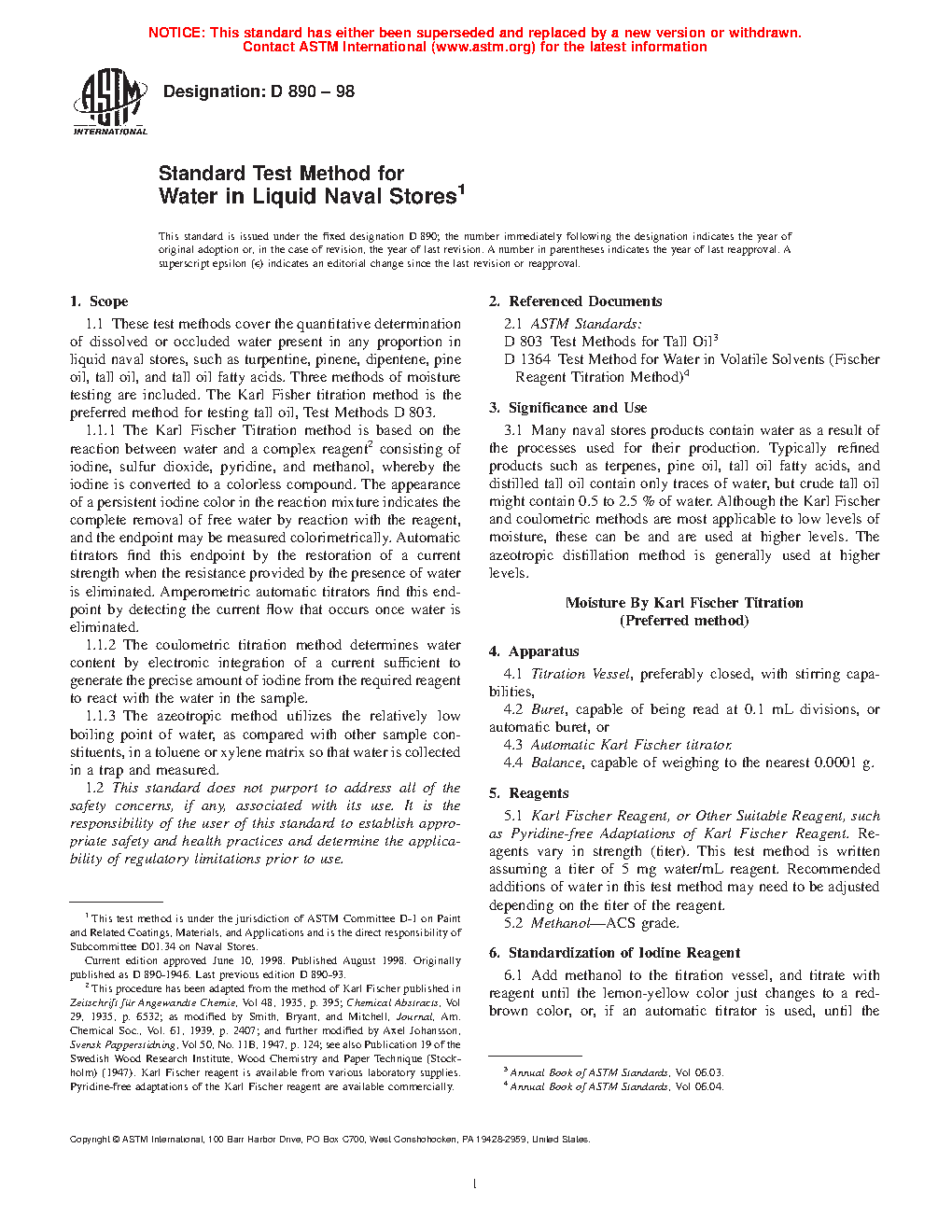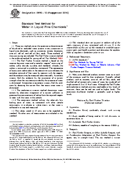 1.1 These test methods cover the quantitative determination of dissolved or occluded water present in any proportion in liquid pine chemicals, such as turpentine, pinene, dipentene, pine oil, tall oil, and tall oil fatty acids. Three methods of moisture testing are included. The Karl Fisher titration method is the preferred method for testing tall oil, Test Methods D803.
