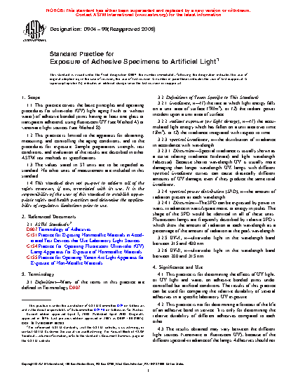 1.1 This practice covers the basic principles and operating procedures for ultraviolet (UV) light aging (with or without water) of adhesive bonded joints having at least one glass or transparent adherend, using fluorescent UV (see Method A) or xenon-arc light sources (see Method B).
