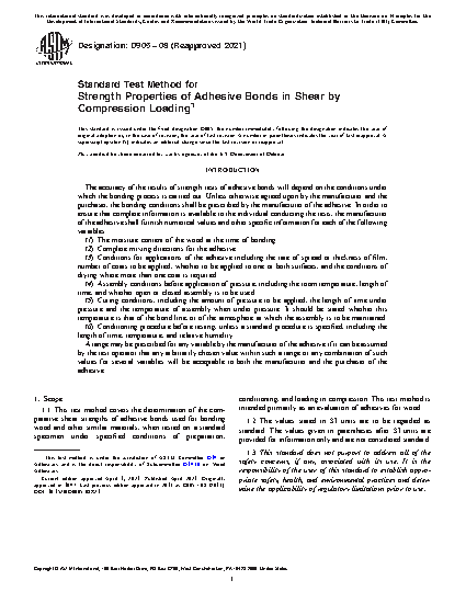 1.1 This test method covers the determination of the comparative shear strengths of adhesive bonds used for bonding wood and other similar materials, when tested on a standard specimen under specified conditions of preparation, conditioning, and loading in compression. This test method is intended primarily as an evaluation of adhesives for wood.